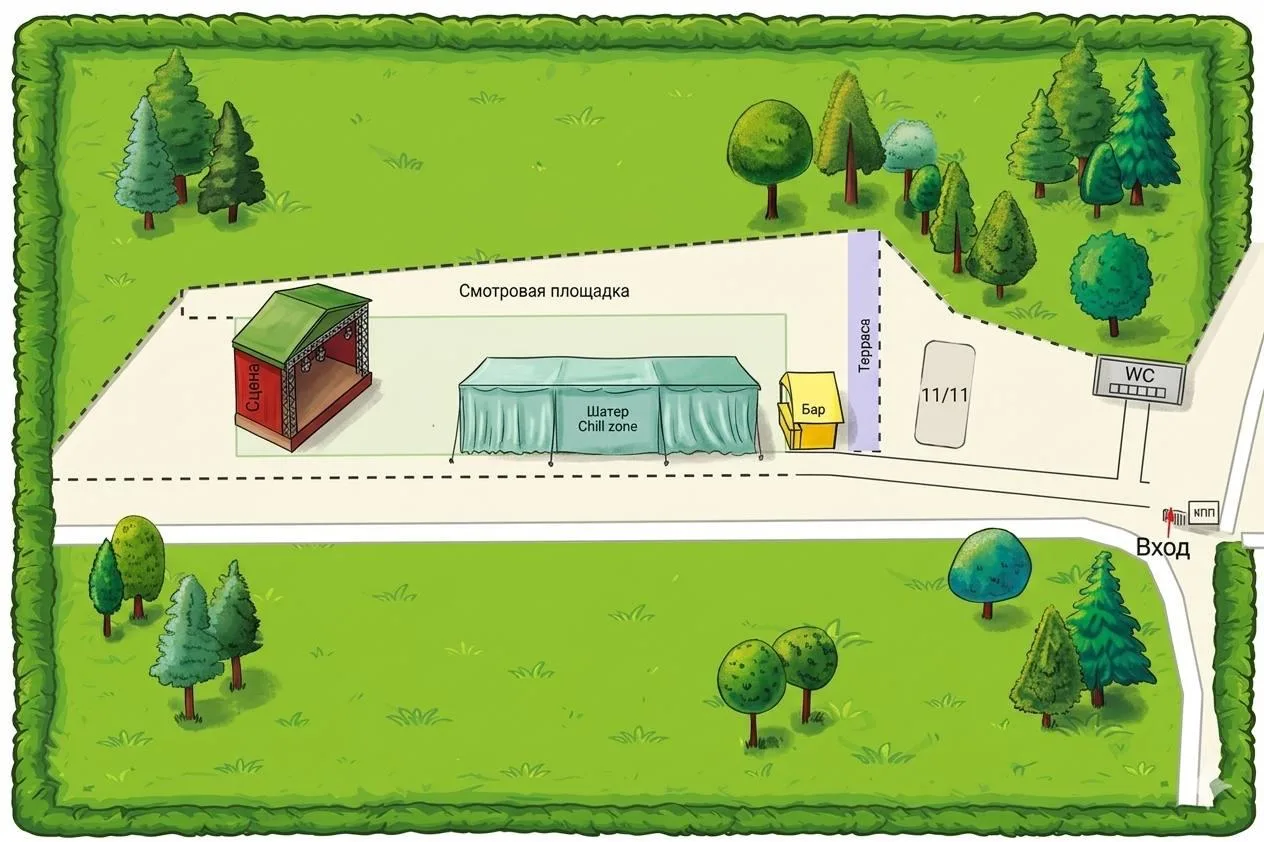 Красные точки на карте обозначают ключевые активности и зоны площадки.
